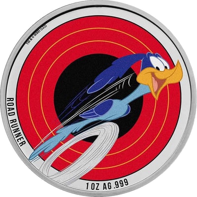 Auf der Motivseite dieser Silbermünze ist der Zeichentrickcharakter Road Runner™ eingeprägt, der aus der bekannten US-amerikanischen Serie Looney Tunes™ stammt. Das Motiv wurde in den Farben koloriert, mit denen der Original-Charakter eingefärbt wurde. Der flinke Vogel rennt lachend durch die Gegend. Sein Gefieder besteht aus mehreren Blautönen. Sein Schnabel ist jedoch gelb. Der Hintergrund erinnert an eine Dartscheibe. Er ist dunkelrot mit mehreren gelben Kreisen und einem großen, schwarzen Kreis in der Mitte.