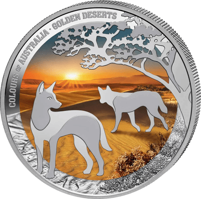 Was diese Darstellung so besonders macht, ist der Kontrast. Die Dingos und der Baum sind in reinem, uncoloriertem Silber gehalten – spiegelglatt und erhaben zugleich. Dadurch scheinen sie förmlich aus der farbigen Wüstenkulisse herauszutreten. Ein Meisterwerk der modernen Prägetechnik.