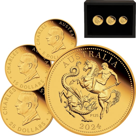 Jede der drei Münzen in diesem Set zeigt eine eindrucksvolle Darstellung des Heiligen Georg, der eine Prinzessin vor einem Drachen rettet. Diese Szene symbolisiert Mut und den Sieg des Guten über das Böse. Die detailreiche Prägung in Polierter Platte (PP) lässt das Motiv in höchster Brillanz erstrahlen. Die Vorderseite jeder Münze ziert das Dan Thorne-Porträt von König Charles III, umgeben von den Inschriften "CHARLES III", "AUSTRALIA" und der jeweiligen Währungsbezeichnung.
