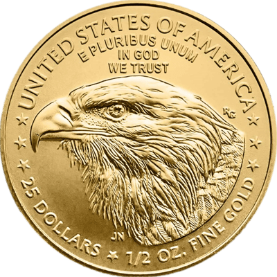 Auf der Vorderseite der Münze thront majestätisch der Adlerkopf, umgeben von den Inschriften „United States of America“, dem Nennwert von 25 USD und dem Feingewicht von 1/2 Unze. Über dem Adlerkopf sind die Schriftzüge „E Pluribus Unum“ und „In God We Trust“ zu lesen, die die Münze zusätzlich zu einem Symbol amerikanischer Werte machen.