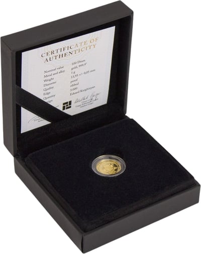 • Material / Feinheit: Die Münze besteht aus Gold mit einer Reinheit von 999/1.000.
