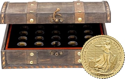 100 x 1/10 Unze Gold Britannia 2026 – Ihr Goldschatz in edler Schatztruhe