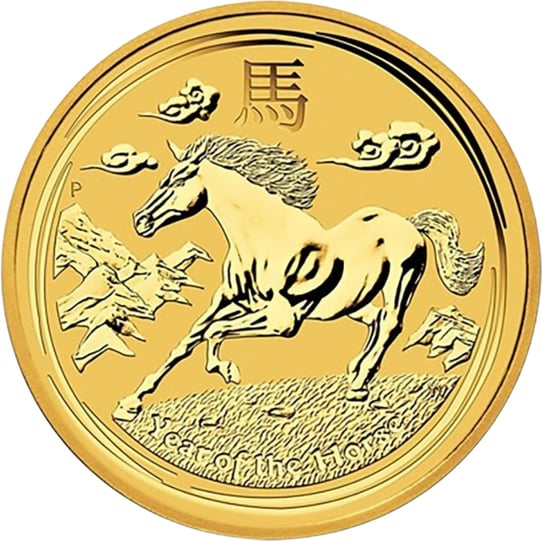 - Motiv: Die Münze zeigt auf der Rückseite ein galoppierendes Pferd in einer stilisierten Szene von Bergen und Wolken. Über dem Pferd ist das chinesische Zeichen für 'Pferd' zu sehen und entlang des unteren Randes die Inschrift 'Year of the Horse'. Das traditionelle 'P' der Perth Mint erscheint auch im Design, über dem Gipfel der Berge.