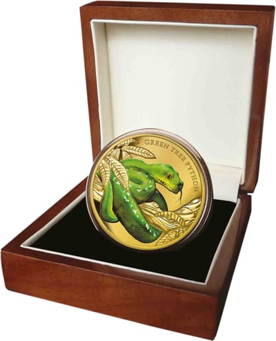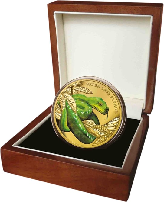 Die Münze präsentiert sich in der höchst möglichen Prägequalität „Polierte Platte“ (PP), was sich in der makellosen Oberfläche und den detailreichen Darstellungen widerspiegelt. Das Motiv der Münze ist der Grüne Baumpython - eine beeindruckende Schlangenart, die für ihre leuchtende grüne Farbe und das außergewöhnliche Muster bekannt ist.