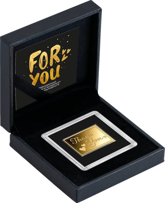 Auf der Rückseite der Münze prangt in elegant geschwungener Schrift der Schriftzug "Thank You", begleitet von zwei liebevoll gestalteten Herzen. Diese fein gearbeitete Botschaft verleiht dem Goldstück eine persönliche Note und macht es zum idealen Geschenk, um tiefe Dankbarkeit und Wertschätzung auszudrücken.