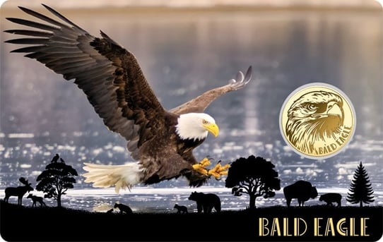Die naturalistische Darstellung des Bald Eagle besticht durch ihre außergewöhnliche Detailtreue. Jede einzelne Feder wurde mit höchster Präzision geprägt. Der charakteristische weiße Kopf, der gelbe Schnabel und die kraftvollen Krallen – all diese Merkmale wurden meisterhaft in reinstes Gold gebannt. Im Hintergrund erkennt man eine stilisierte Landschaft mit Nadelbäumen, Bären und Hirschen, die den natürlichen Lebensraum des stolzen Greifvogels widerspiegelt.