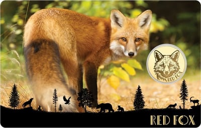 Die untere Kante ziert eine schwarze Silhouette einer Waldlandschaft. Tannen und Fichten rahmen verschiedene Wildtiere wie Wolf, Bär und Hirsch ein – eine Hommage an die natürliche Umgebung des Fuchses. Diese durchdachte Komposition macht jede einzelne Münze zu einem kleinen Kunstwerk.