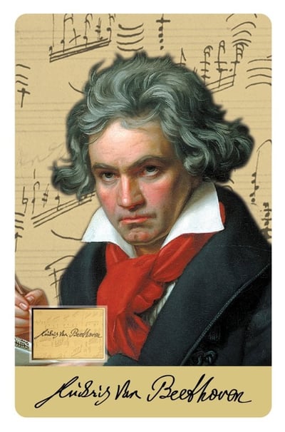 • Motiv: Detailreiches Portrait des legendären Komponisten Ludwig van Beethoven vor historischen Notenblättern