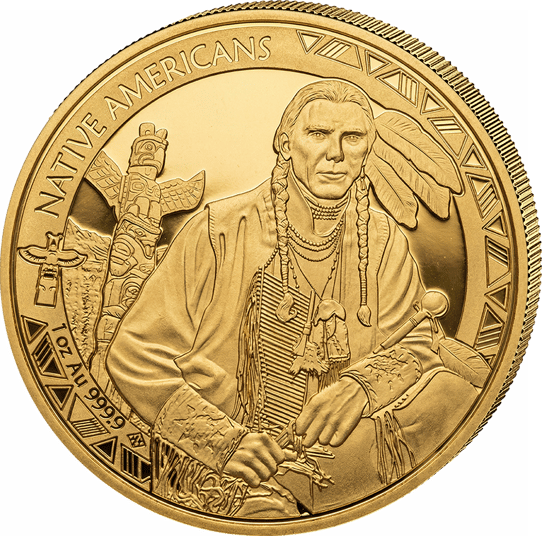 Die Detailtiefe ist atemberaubend. Jede Feder, jede Perle der Halskette, jede Schnitzerei am Totempfahl – alles wurde mit einer Präzision umgesetzt, die nur bei Münzen dieser Klasse zu finden ist. Am unteren Rand der Motivseite findet sich die Angabe „1 oz Au 999.9", umrahmt von kulturell inspirierten Mustern, die dem Gesamtbild eine authentische Tiefe verleihen. Der Schriftzug „NATIVE AMERICANS" zieht sich elegant am oberen Rand entlang.