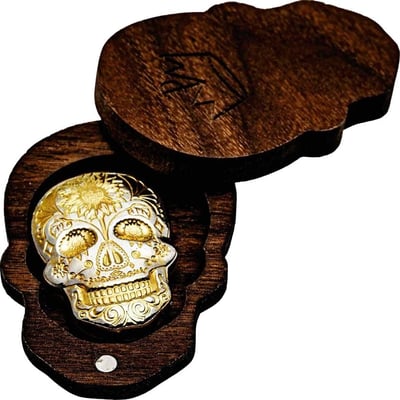 Die teilvergoldeten Verzierungen, angeführt von der prachtvollen Sonnenblume auf der Stirn des Totenkopfes, sind mit echtem 24-karätigen Gold überzogen. Dieses Detail verleiht dem Barren neben seinem Anlagewert auch ein ästhetisches Prestige.