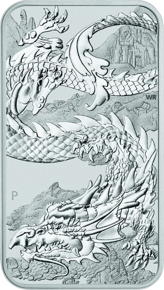 Lassen Sie sich von der mystischen Drachenwelt verzaubern, die sich in dieser beeindruckenden, rechteckigen Silbermünze offenbart. Diese einmalige Mischung aus Münze und Barren, geprägt von der renommierten Perth Mint, kombiniert die ästhetische Anziehungskraft eines Silberbarrens mit dem kulturellen Reichtum und der Anlageattraktivität einer Münze.