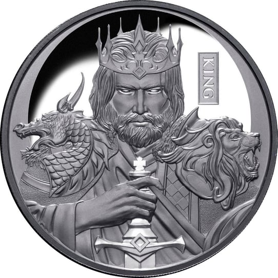 Die künstlerische Darstellung dieser eindrucksvollen Silbermünze feiert den Schachkönig – das Herz jedes Schachspiels. Der Schachkönig, obwohl nicht die stärkste Figur auf dem Brett, symbolisiert dennoch das ultimative Ziel jeder Schachpartie. Das Münzmotiv zeigt einen majestätischen König mit leicht gesenktem Haupt, flankiert von den Köpfen eines Löwen und eines Drachen – Symbole für Stärke und Weisheit. In seiner Brust hält er ein Schwert, ein Zeichen von Macht und Autorität. Begleitet wird die Darstellung von der Aufschrift „KING“.