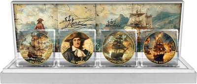 Jede der vier hochwertig kolorierten und teilvergoldeten Münzen ist ein Zeugnis hoher Prägungskunst und detailverliebter Handwerkskunst. Auf der Vorderseite jeder Münze erstrahlt das Abbild des großen Entdeckers Christoph Kolumbus oder die majestätischen Schiffe, die ihn auf seiner Reise begleiteten. Die Rückseite ziert jeweils ein Ausschnitt einer alten Weltkarte, die die Epoche der großen Entdeckungen repräsentiert und die Betrachter in eine Zeit voller Abenteuer und Entdeckungen entführt.