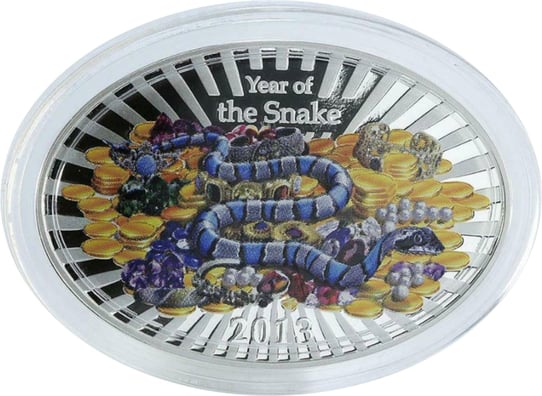 Der chinesische Tierkreiszeichenkalender ist sehr beliebt für verschiedene Münzserien. Jedes Jahr erscheint ein neues Motiv, welches sich an dem Tier aus dem Zyklus orientiert. 2013 ist das Jahr der Schlange. Die Münze zeigt uns eine Schlange die sich durch Goldmünzen und Edelsteinen schlingelt. Die liebevolle und detaillierte Colorierung verleiht der Münze einen besonderen Charme. Dass diese Münze etwas Besonderes ist, sieht man schon auf den ersten Blick. Angefangen von der ovalen Form, hin zur Colorierung bis hin zur edlen und extravaganten Verpackung. Die Münze ist in höchster Prägequalität “Polierte Platte” geprägt und ist weltweit auf 8.000 Stück limitiert.
