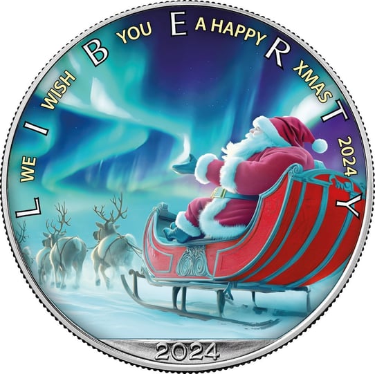 - Design: Die Vorderseite zeigt einen majestätischen Weihnachtsmann im Schlitten unter einem von Polarlichtern erleuchteten Nachthimmel. Die Rückseite präsentiert den klassischen Weißkopfseeadler mit Eichenzweig.