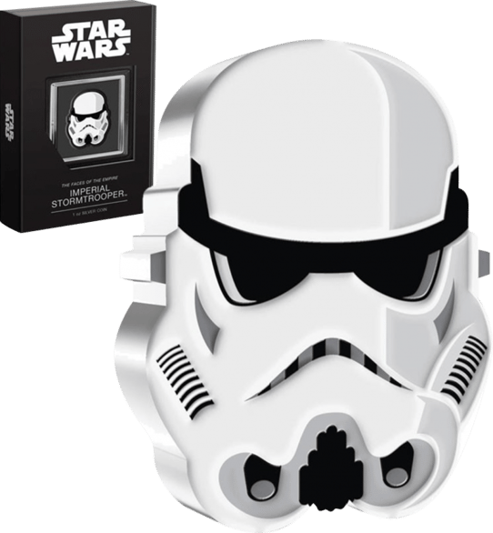 Diese 1 Unze Silbermünze ist in Form des bekannten Stormtrooper Helms geprägt worden. Durch die Ultra High Relief Gestaltung nimmt die Münze auch die Konturen des Helmes perfekt an. Die Colorierung in Weiß und Schwarz lässt die Münze noch detaillierter wirken. Die Stormtrooper waren die Elitesoldaten des Galaktischen Reiches unter der Führung von Kaiser Palpatine. Kommanadant der Truppen waren Grand Moff Tarkin und Darth Vader. Mit Hilfe des starken Heeres aus Clonetrooper konnte Palpatine seine Macht halten und die Jedi ausrotten.