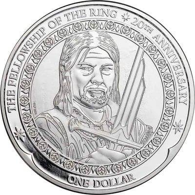 Die Münze zeigt Boromir im Angesicht von Narsil, dem Schwert des Königs. Er ist zunächst fasziniert, wendet sich aber sofort ab, als er Aragorns Gegenwart bemerkt – noch lehnte er jeden Gedanken eines neuen Königs über seine Heimat ab. Das Motiv ist umrandet von Blättern, die für die Elbenlande stehen. Am Rand ist zu lesen „THE FELLOWSHIP OF THE RING“ „20TH ANNIVERSARY“ und „ONE DOLLAR“. Auf der Rückseite ist die Queen Elizabeth II. abgebildet – interessant: dazu ist eingeprägt: „MIDDLE EARTH“.