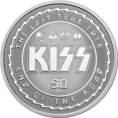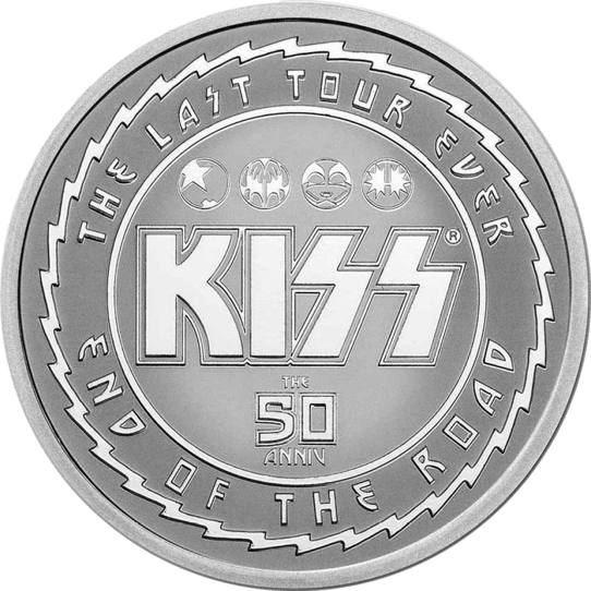 Auf der Vorderseite zeigt die Münze eine Darstellung des KISS-Logos sowie die vier charakteristischen Gesichtszeichnungen der Gründungsmitglieder Paul Stanley, Gene Simmons, Ace Frehley und Peter Criss, die auf der Bühne "The Starchild", "The Demon", "The Spaceman" und "The Catman" repräsentierten. Unterhalb des Logos befindet sich die Aufschrift "THE 50 ANNIV", während die Aufschrift "THE LAST TOUR EVER - END OF THE ROAD" entlang des Randes verläuft.