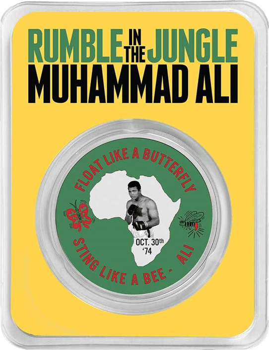 Die Münze zeigt auf der Vorderseite den berühmten Schriftzug "Float like a Butterfly, Sting like a Bee" auf einem grünen Hintergrund. Eingebettet in die Silhouette des afrikanischen Kontinents ist ein Abbild von Muhammad Ali und das Datum des legendären Kampfes. Die Rückseite ziert das Wappen von Niue und eine Ecke eines Boxrings. Diese detailreiche Gestaltung, gepaart mit der hohen Qualität des verwendeten Silbers, macht die Münze zu einem begehrten Sammlerstück.