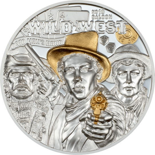 Die High Relief Prägung verleiht der Münze eine besondere Optik und Haptik, die den Charakter der Wild-West-Ikonen in dreidimensionaler Form zum Leben erweckt. Teilvergoldete Elemente, wie die Darstellung der "Dead Man’s Hand" und die Kugel der Pistole, die Wild Bill tötete, setzen zusätzliche Akzente und steigern die Exklusivität dieser Rarität.