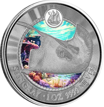 Die Vorderseite der Münze zeigt einen farbenprächtigen Stachelrochen, der sich elegant durch die Korallen seines Lebensraumes bewegt. Diese Colorierung bringt die Szenerie zum Leben und hebt die Münze von anderen Silbermünzen ab. Der geriffelte Rand und das hochauflösende Color Proof Finish unterstreichen das exklusive Design und die Qualität der Münze.