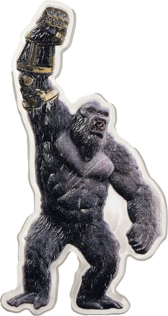 Die Vorderseite (Obverse) der Münze zeigt eine offiziell lizenzierte, colorierte Abbildung von Kong, wie er im Film "Godzilla x Kong: The New Empire" von 2024 zu sehen ist. Die Rückseite (Reverse) ziert das wiederholte Logo des Films, das auf der Rückseite des geformten Stückes zu sehen ist. Die detailreiche Gestaltung und die Farbgebung machen das Sammlerstück zu einer echten Rarität und einem Blickfang in jeder Vitrine.