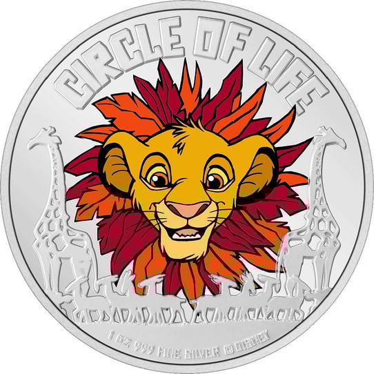 Die Münze zelebriert mit ihrer colorierten Darstellung des kleinen Löwen Simba, umgeben von einem Ring aus roten und orangen Blättern, das Leben und die unvergesslichen Momente des Films. Die sorgfältig ausgewählten Farben bringen das lebendige Ambiente der afrikanischen Savanne direkt in Ihre Sammlung. Der Schriftzug "CIRCLE OF LIFE" und die Abbildungen der Savannenbewohner im Hintergrund vervollständigen dieses einzigartige Kunstwerk.