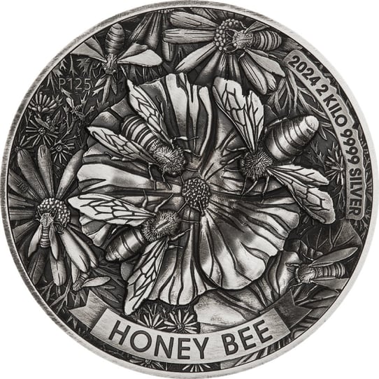 Das Motiv der Münze ist eine detailreiche Darstellung von drei Honigbienen auf den Blütenblättern einer Blume. Im Hintergrund sind weitere Bienen und eine Vielzahl von Blumen zu erkennen, was das Gefühl eines lebendigen und dynamischen Bienenstocks vermittelt. Die Aufschriften "HONEY BEE" und "2024 2 KILO 9999 SILVER" sind kunstvoll in das Design integriert und runden die Gesamtkomposition ab. Die Rückseite zeigt das Porträt von König Charles III und trägt den offiziellen Nennwert von 60 AUD.