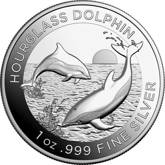 Das Motiv dieser Sammlermünze zeigt zwei Stundenglasdelfine, die dynamisch in das Wasser und aus dem Wasser heraus springen. Die Darstellung der Delfine, die das Meer mit ihren Schwanzflossen aufwühlen, ist ein fesselndes Schauspiel. Im Hintergrund sind der Horizont und die untergehende Sonne zu sehen, was der Münze eine besondere Atmosphäre verleiht. Ergänzt wird das Design durch die Aufschriften „HOURGLASS DOLPHIN“ und „1 oz .999 FINE SILVER“.