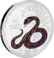 Das Motiv dieser beeindruckenden Münze zeigt eine detailliert gezeichnete Schlange, die sich in den Farben Rot, Pink und Orange majestätisch über die Münze schlängelt. Die Schlange ist mit asiatisch anmutenden Blumenmustern verziert, die das Design noch faszinierender machen. Im Hintergrund sind geprägte, traditionelle chinesische Ornamente und Muster zu erkennen, die das Motiv kunstvoll umrahmen. Am oberen Rand der Münze befindet sich der Schriftzug „YEAR OF THE SNAKE“ in Großbuchstaben, während das chinesische Schriftzeichen für Schlange unterhalb der Schlange zu sehen ist. Am unteren Rand der Münze steht „1 oz .999 Fine Silver“, was auf den Feingehalt und das Gewicht der Münze hinweist.