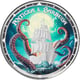 Faszinierendes Kraken-Motiv: Die mystische Darstellung eines Krakens mit Segelschiff in brillanter Farbgebung macht diese Silbermünze zu einem einzigartigen Kunstwerk