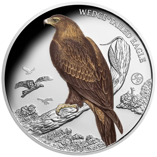 Die detailverliebte Gestaltung dieser Silbermünze basiert auf den weltberühmten Zeichnungen des britischen Ornithologen John Gould. Der prachtvolle Keilschwanzadler thront in naturgetreuer Farbgebung auf einem verwitterten Ast. Sein durchdringender Blick und das detailliert ausgearbeitete Federkleid zeugen von höchster Präzision. Im Hintergrund schweben weitere Artgenossen durch die Lüfte – eine dynamische Szenerie, die Leben in das Motiv bringt.