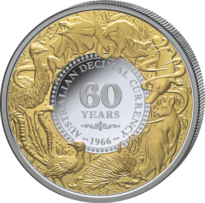 1 Unze Silber 60 Jahre Dezimalwährung in Australien 2026 (Auflage: 1.250 | teilvergoldet | Polierte Platte)