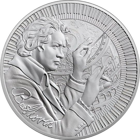 Der renommierte Münzdesigner Joel Iskowitz hat mit dieser Prägung ein wahres Kunstwerk geschaffen. Die Vorderseite zeigt den großen Komponisten in einer dynamischen Dirigierpose, während im Hintergrund die majestätische Ungarische Staatsoper zu Budapest zu sehen ist. Besonders eindrucksvoll ist die detaillierte Klaviertastatur, die sich kunstvoll am Münzrand entlangzieht, sowie Beethovens originale Signatur.