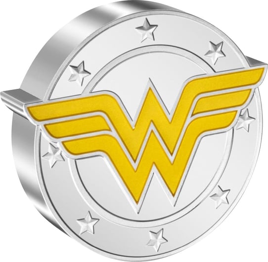 Auf der Vorderseite dieser Silbermünze können Sie das offizielle Logo der Wonder Woman™ sehen. Dieses besteht aus zwei gelben Buchstaben W, die übereinander stecken. Das Logo der Wonder Woman™ ist ein Symbol für eine starke, mutige und mächtige Frau. Das Logo wird hier von einem Sternen-Kreis umgeben.