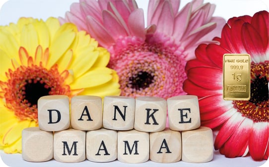 Ein Geschenk von bleibendem Wert: Der 1g Goldbarren Heimerle und Meule Danke Mama FineCard