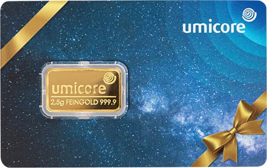 Edles Geschenk: Der 2,5 g Goldbarren von Umicore, verpackt in einer Geschenkkarte, ist das ideale Präsent für besondere Anlässe