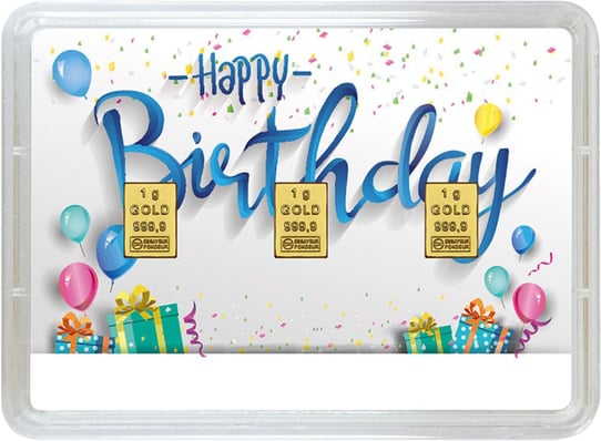 Geschenke bekommt eigentlich jeder gerne. Warum nicht also etwas Schenken, das zeitlos ist, schön aussieht und auch noch funktional ist? Das Happy-Birthday Geschenkset besteht aus 3x 1g Goldbarren. Auf der Vorderseite der Barren sind die Angaben „1g“, „GOLD“, „999,9“ und „ESSAYEUR FONDEUR“. Die Vorder- und Rückseite des Blisters sind bunt mit klassischem „Happy Birthday“-Schriftzug verziert. Hinzu kommen stimmungsmachende Konfetti, Luftballons und Geschenke. Bei dem Valcambi Geschenkbarren handelt es sich um Neuware.
