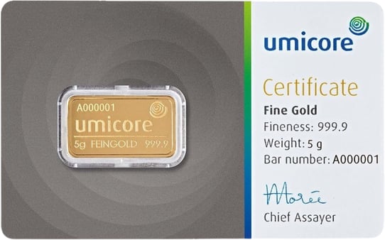 Dieser 5 g Goldbarren wird von der Firma Umicore AG & Co. KG produziert. Das Unternehmen hat unter anderem auch in Deutschland eine Filiale. Viele unserer Kunden vertrauen auf die stabilen Anlagebarren von Umicore, ein Hersteller, der für seine hochwertigen Edelmetalle weltweit bekannt ist. Umicore produziert dabei nicht nur Edelmetalle zur Herstellung von Schmuck, sondern auch für Katalysatoren und weitere Produkte aus der Industrie.