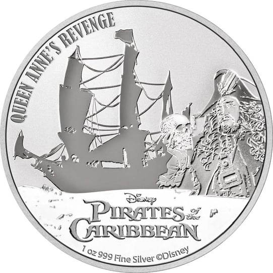 Die Münze beeindruckt mit ihrer hohen Qualität und ihrem detailreichen Design. Auf der Motivseite wird das Piratenschiff Queen Anne's Revenge in all seiner Pracht dargestellt, zusammen mit dem berüchtigten Piratenkapitän Edward Teach, der einen Totenkopf in seiner Hand hält. Der Name der Ausgabe "QUEEN ANNE'S REVENGE", die Inschrift "Disney PIRATES of the CARIBBEAN", das Feingewicht und die Feinheit "1 oz 999 Fine Silver" sind ebenfalls auf dieser Seite dargestellt.