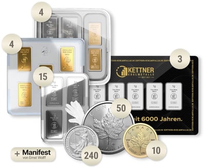 Mit der Einlagensicherung L investieren Sie in eine stabile und wertbeständige Anlageform, die Ihnen Schutz vor Inflation und wirtschaftlicher Unsicherheit bietet. Die Vielfalt und Qualität der enthaltenen Edelmetalle machen dieses Paket zu einer idealen Wahl für jeden Anleger, der auf langfristige Sicherheit und Wertsteigerung setzt.