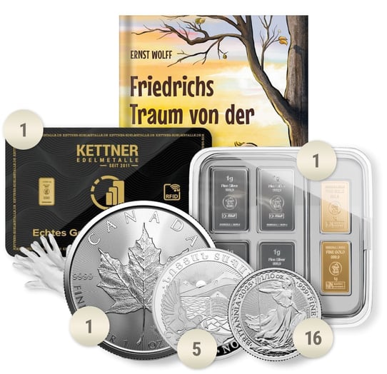 Warten Sie nicht länger und sichern Sie sich das Freiheits-Paket S. Investieren Sie in Ihre Zukunft und vertrauen Sie auf die jahrzehntelange Expertise von Kettner Edelmetalle. Mit diesem Paket sind Sie bestens gerüstet, um den Herausforderungen der Zukunft mit Sicherheit und Gelassenheit entgegenzutreten.