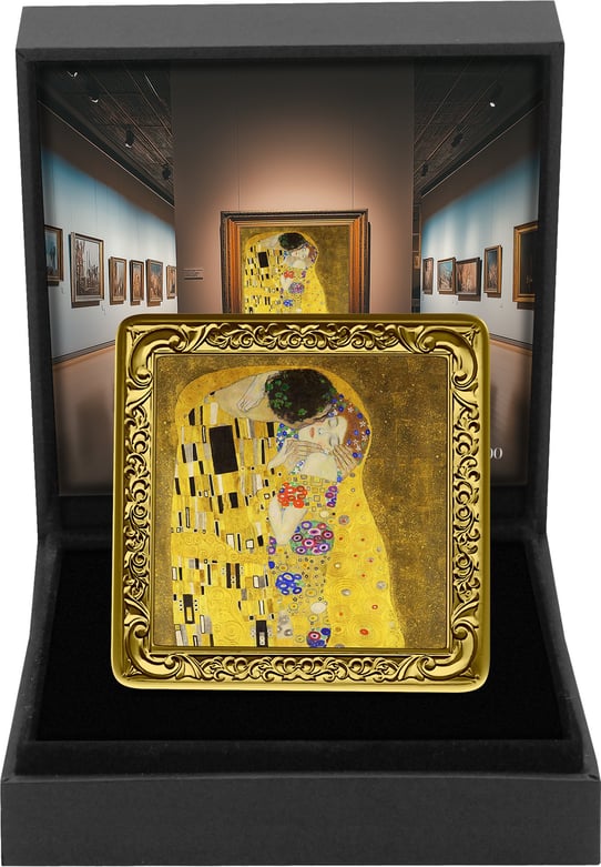 Mit dieser Sammlermünze präsentieren wir Ihnen eine seltene Sammlermünze, die Gustav Klimts berühmtestes Werk "Der Kuss" in beeindruckender Weise interpretiert. Der quadratische Silberbarren zeigt auf der Vorderseite das weltbekannte Gemälde in brillanten Farben, während die Rückseite ein ausdrucksstarkes Porträt des Künstlers präsentiert.