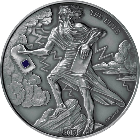 Das Münzmotiv zeigt den Moment, als Moses auf dem Berg Sinai die Tafeln mit den zehn Geboten von Gott bekommen hat. Im Hintergrund von Moses wütet ein Gewitter. Auffgrund der Antik Finish Veredelung bekommt die Münze einen nostalgischen Charme und dadurch ist die Münze vor der Milchfleckenbildung geschützt.