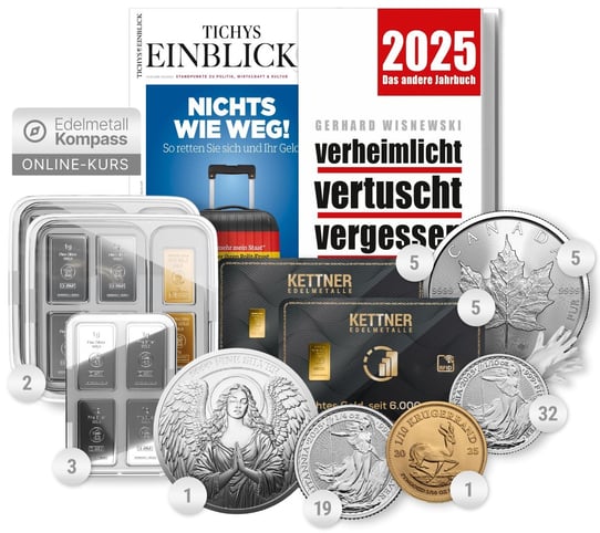 Mit unserem strategisch konzipierten Krisenschutz Paket M bieten wir Ihnen maximale Sicherheit durch eine perfekt ausbalancierte Kombination aus Gold und Silber. Die sorgfältig gewählten Stückelungen vereinen optimalen Inflationsschutz mit der Flexibilität eines praktischen Tauschmittels - die ideale Lösung für alle, die in unsicheren Zeiten auf umfassenden Vermögensschutz setzen.