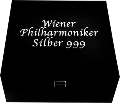 Ästhetisches Design: Schwarze Masterbox mit klassischem Aufdruck 'Wiener Philharmoniker Silber 999', eine Zierde für jede Sammlung